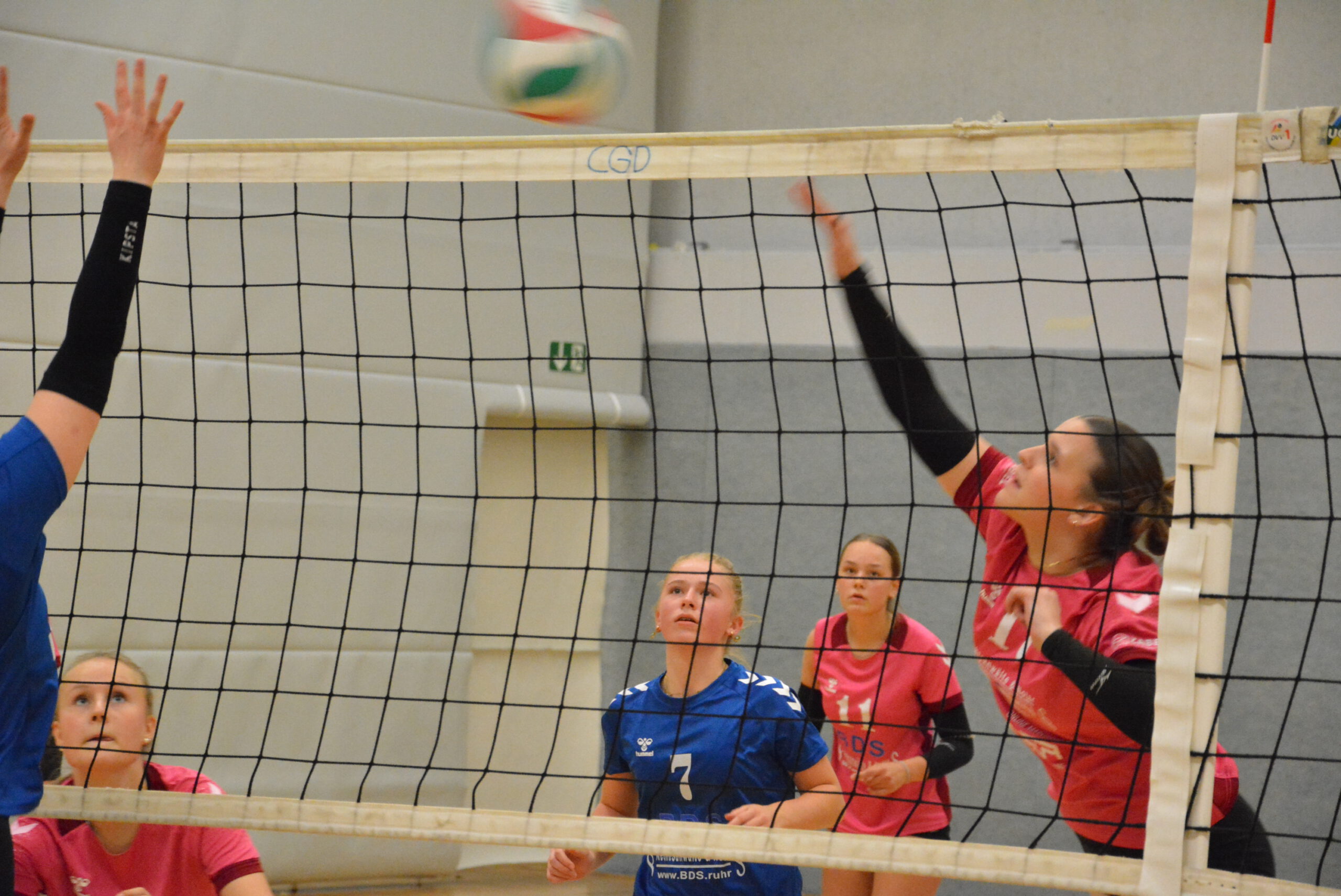 Lange Zeit verlief die Partie auf Augenhöhe. Wir hatten leichte spielerische Vorteile, doch die routinierten GV-Spielerinnen konnten immer wieder die Löcher in unserer Abwehr finden und treffen und erzielten so zahlreiche Punkte. Zum Ende des ersten Satzes hin konnten sich unsere Mädels – alle im U16- bis U20-Alter – absetzen und den Satz für sich entscheiden (25:20). Im zweiten Satz war es noch knapper, hier mussten sie sogar einen GV-Satzball abwehren, ehe sie ganz knapp mit 26:24 gewannen. Im dritten Satz schien Waltrop zunächst aufgegeben zu haben, wir führten lange deutlich. Dann erhöhte der GV seine Angriffseffizienz nochmal, überlistete unsere Abwehr ein ums andere mal und kam Punkt für Punkt heran. Am Ende konnten unsere Mädels den Satz aber noch zumachhen (25:18).