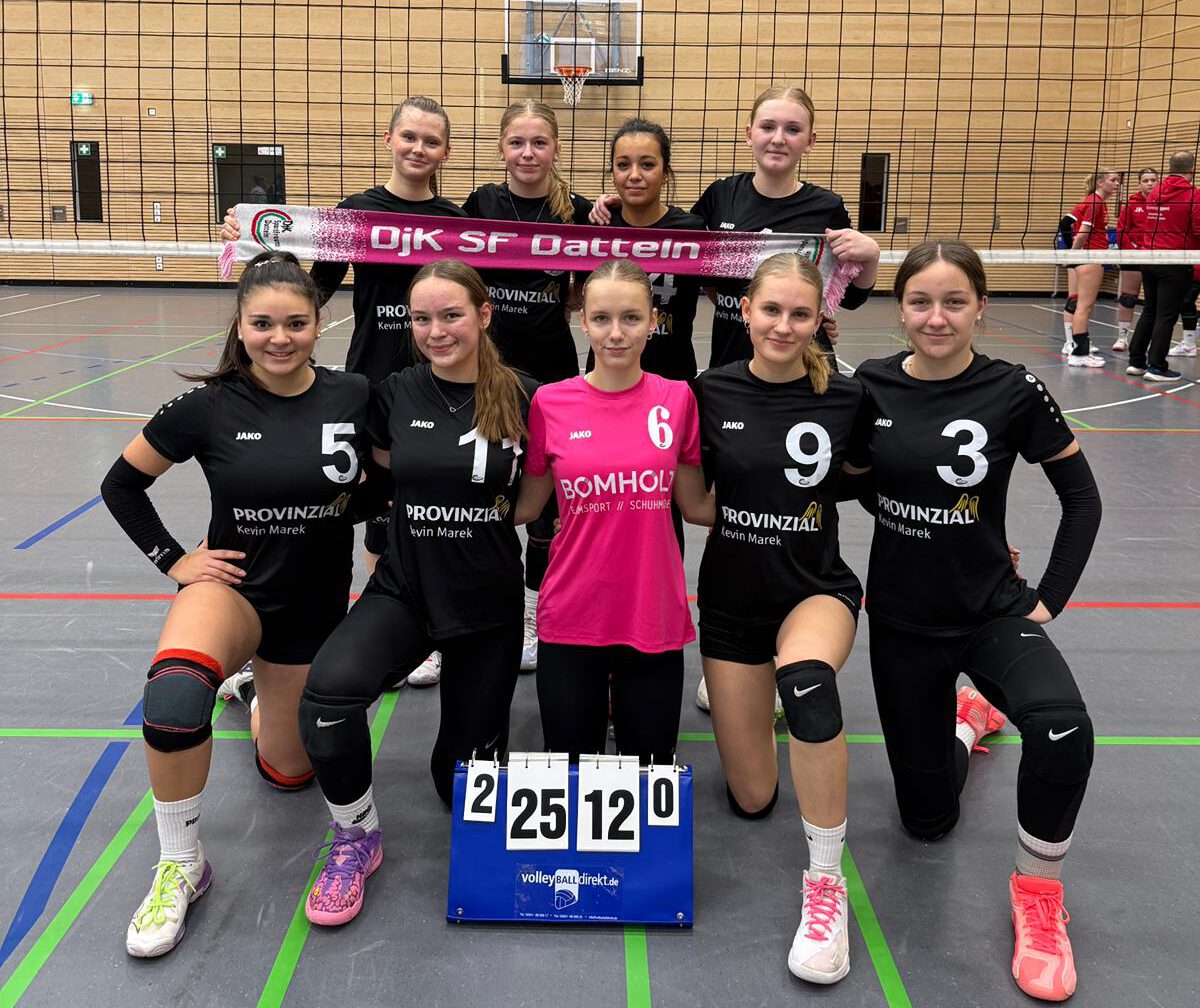 … darf sich die WU18/I nennen. Am letzten Spieltag traf die Mannschaft auf die relativ schweren Gegner SV Bösensell und SCU Lüdinghausen II – immerhin Tabellendritter und vierter. Gegen die SCU-Mannschaft war es stets eine klare Sache (25:12,25:13), gegen Bösensell begann es sogar noch deutlicher (25:8). Dann schalteten die Mädchen einen Gang zurück, der SV kam immerhin auf 17 Punkte heran. Am Ende war der Sieg aber nie gefährdet. Trainerin Andrea musste auf Mihaela verzichten, aber Luise sprang zum wiederholten Mal über Mitte ein und fühlt sich dort schon fast ein bisschen wie zu Hause.